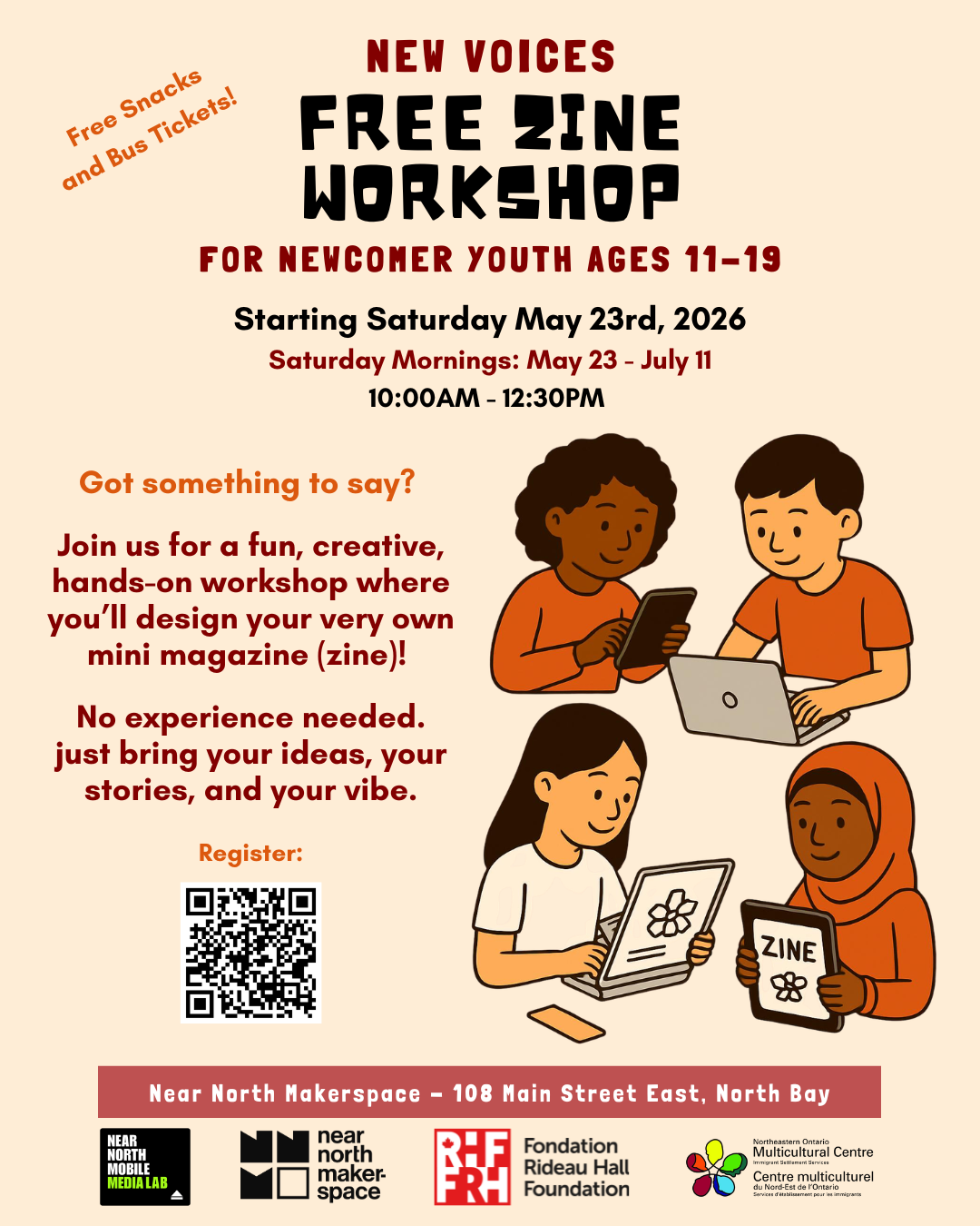 Registration is now open for the New Voices Zine Workshop, a free workshop series for newcomer youth ages 11–19 living in North Bay.